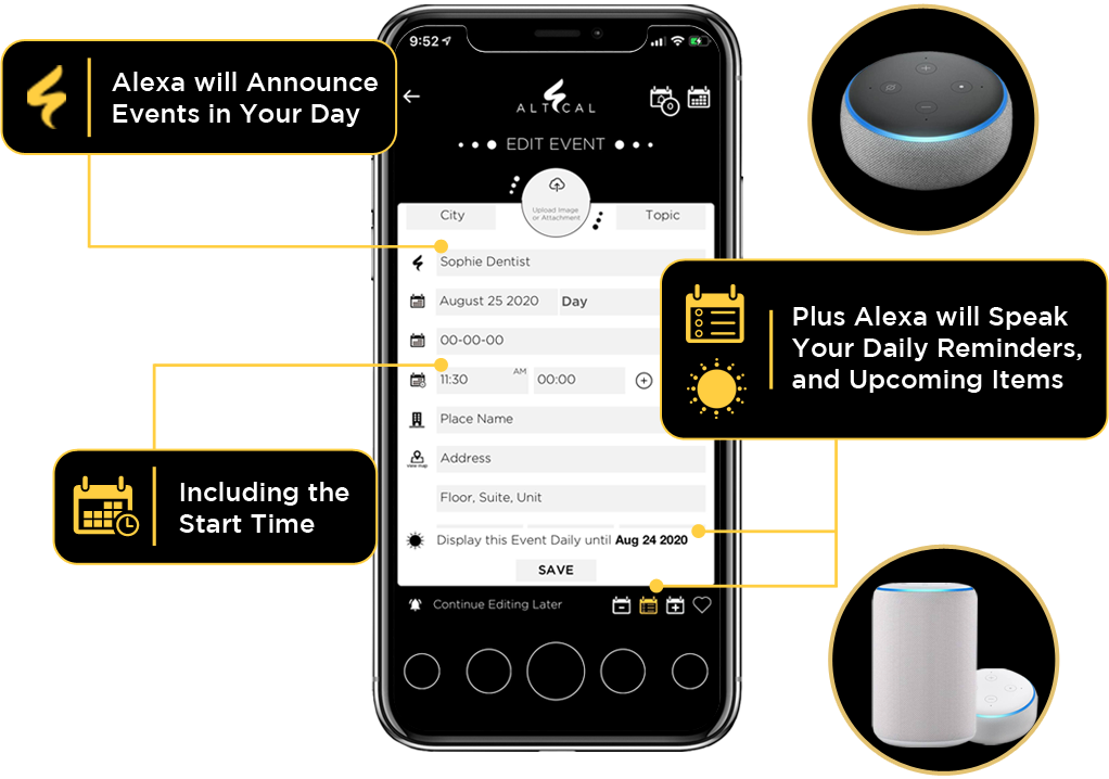 Experience your calendar in surround sound. Get Your Daily Events, along with Reminders and Alerts. Simply Say "Alexa what's on My AltCal" and Alexa will take over from there.